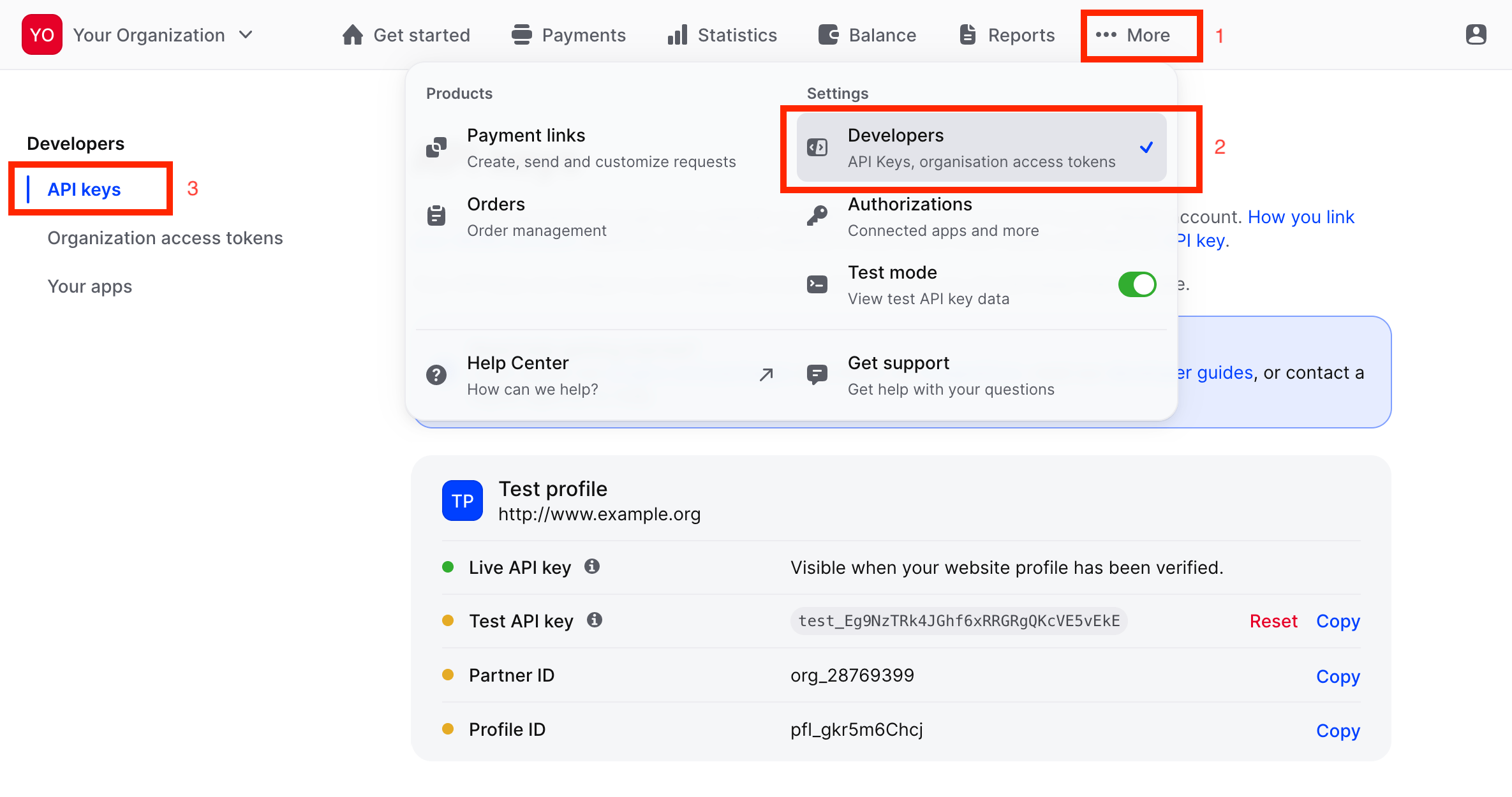 Click on `More` menu item in top menu and go to `Developers > API keys` and copy all necessary keys for further usage at VirtueMart side in payment method: