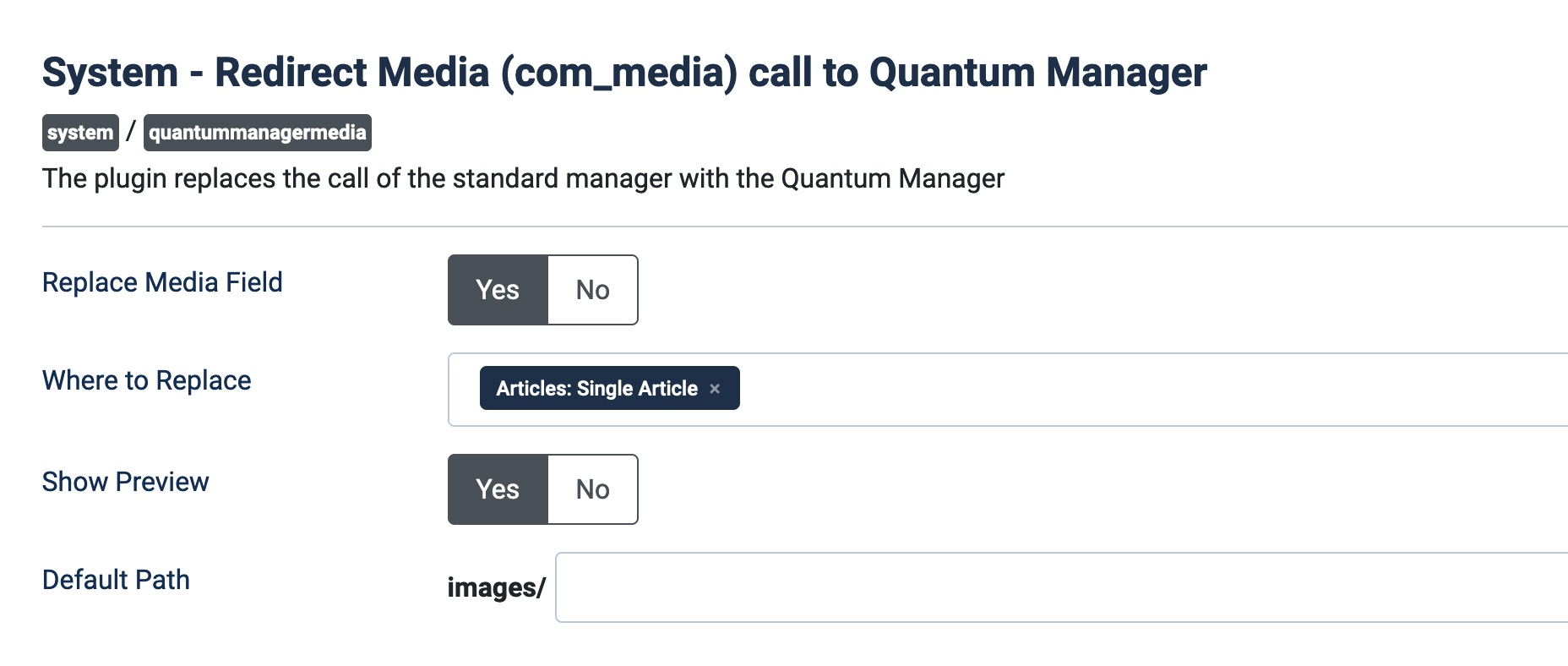 It is possible to replace Joomla's core media field to Quantum Manager's media field . Go to a plugin called **System - Redirect Media (com\_media) call to Quantum Manager** and find the following parameter: