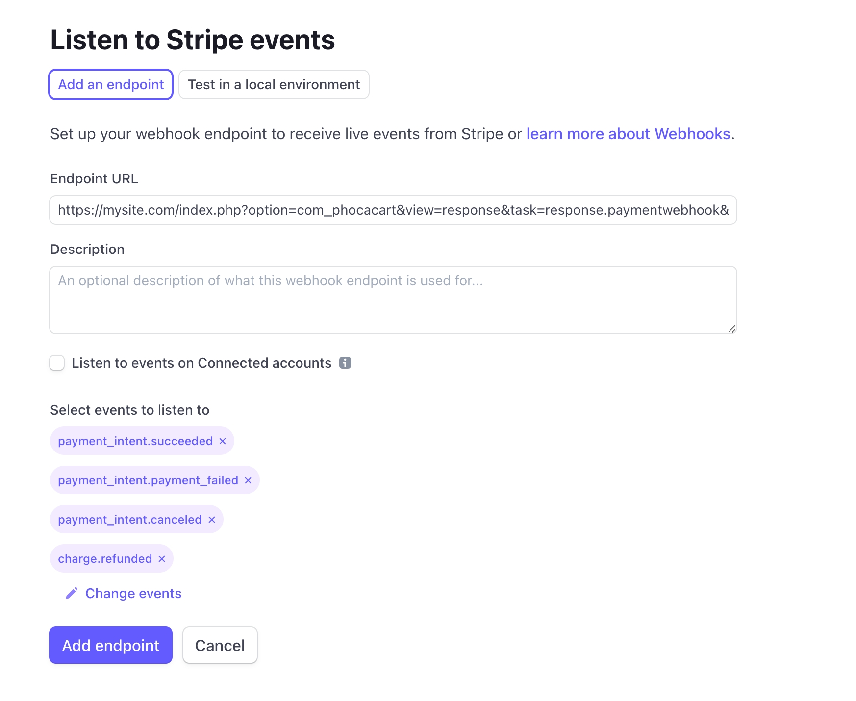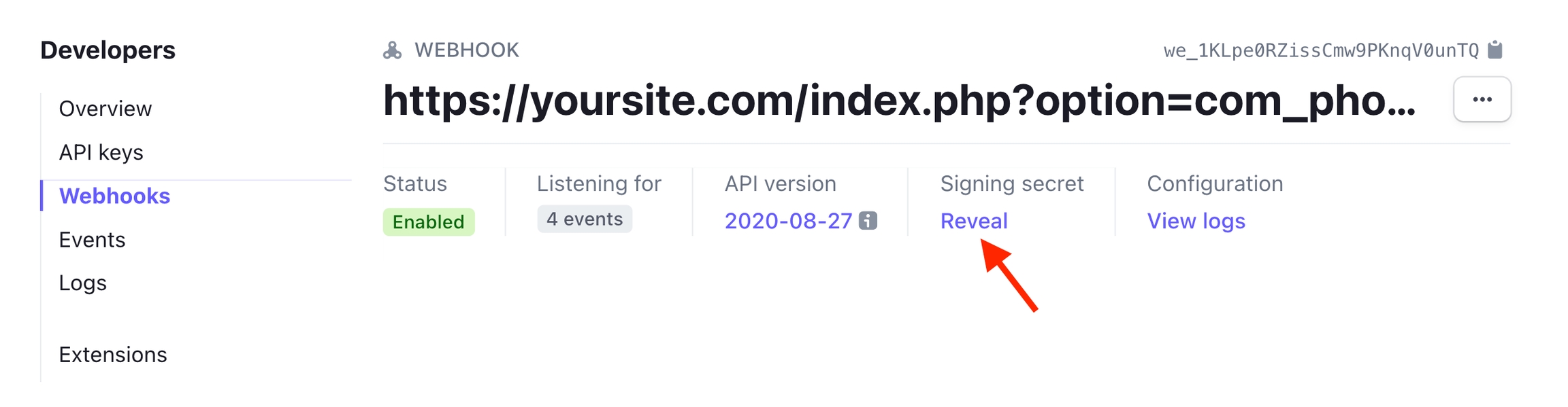 Find Click to reveal button and copy the Webhook Secret for further usage in Phoca Cart payment method.