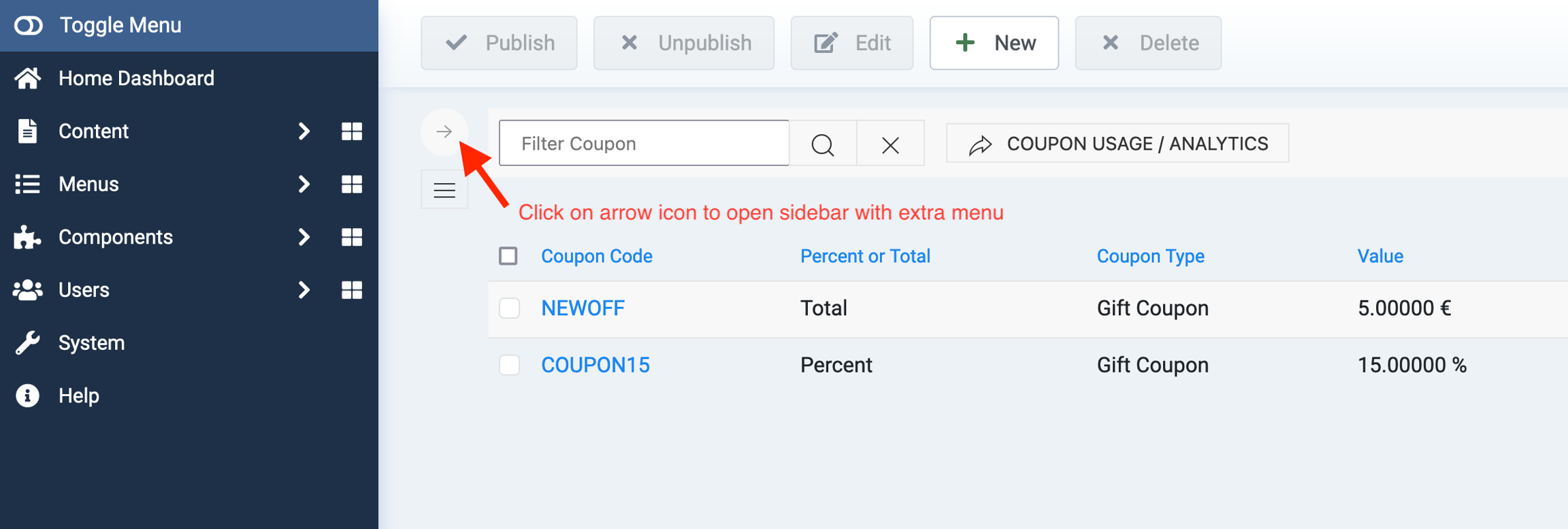 Go to VirtueMart > any page and click on arrow icon to open sidebar for additional links (sidebar is closed by default).