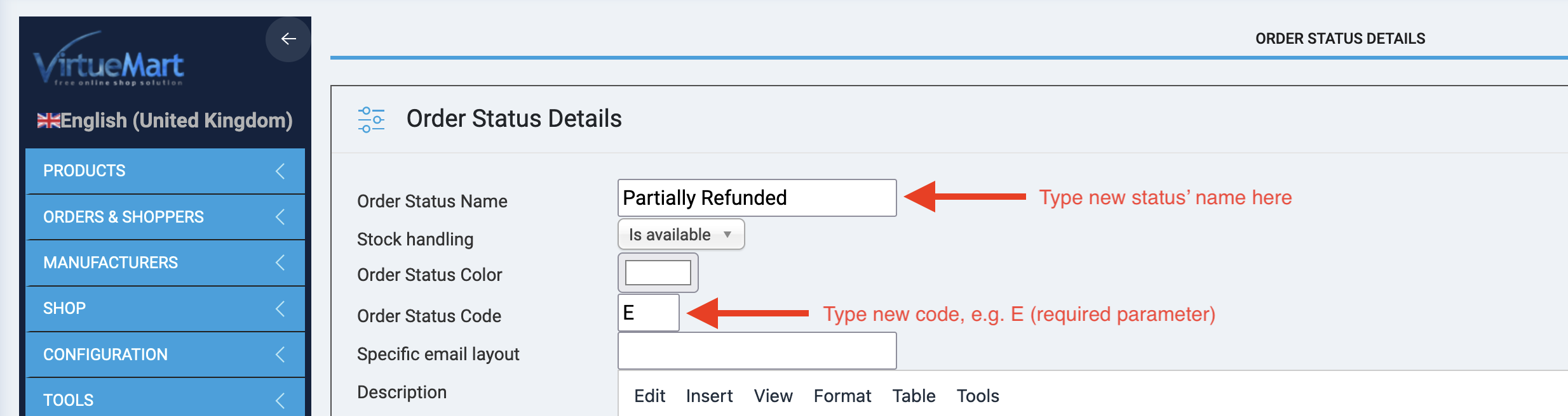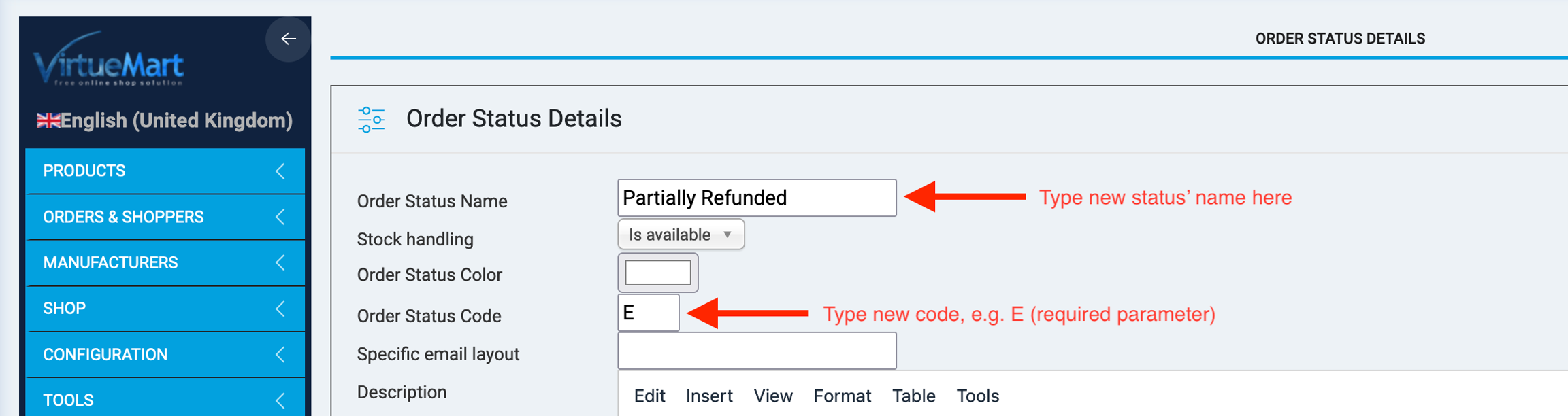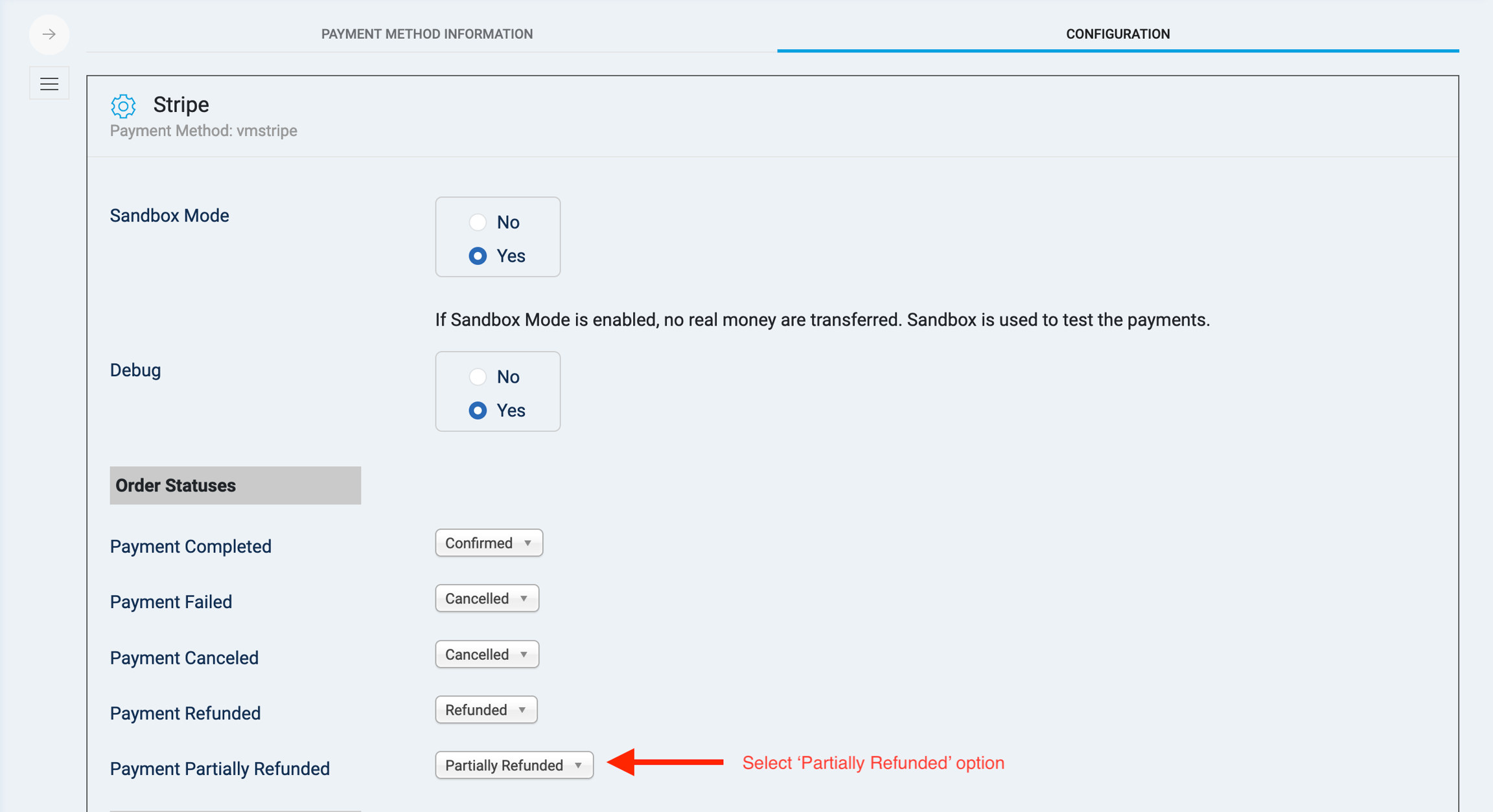 Stripe allows to release partially refund while VirtueMart doesn't have such order status by default. We need to create new status.