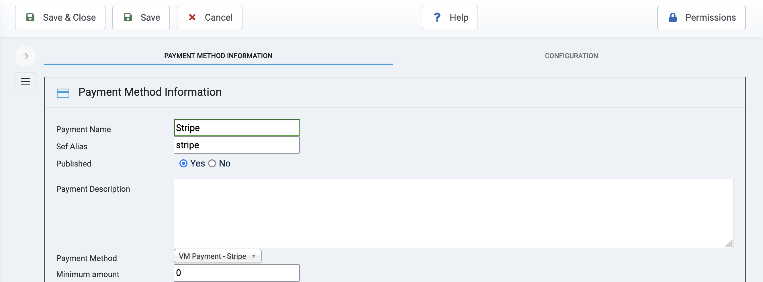 <figure><img src="https://norrnext.com/images/docs/vm-stripeco5.png" alt=""><figcaption><p>VirtueMart - Payment Method Information</p></figcaption></figure>