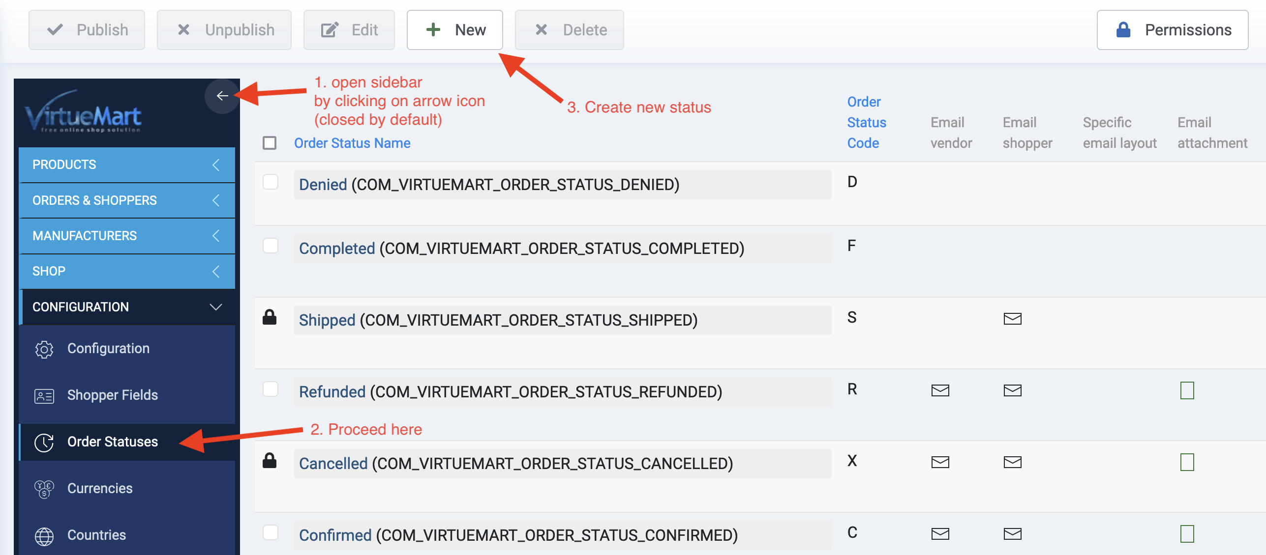 Open extra menu with menu items by clicking on Arrow icon (sidebar is closed by default) and go to Configuration > Order Statuses.